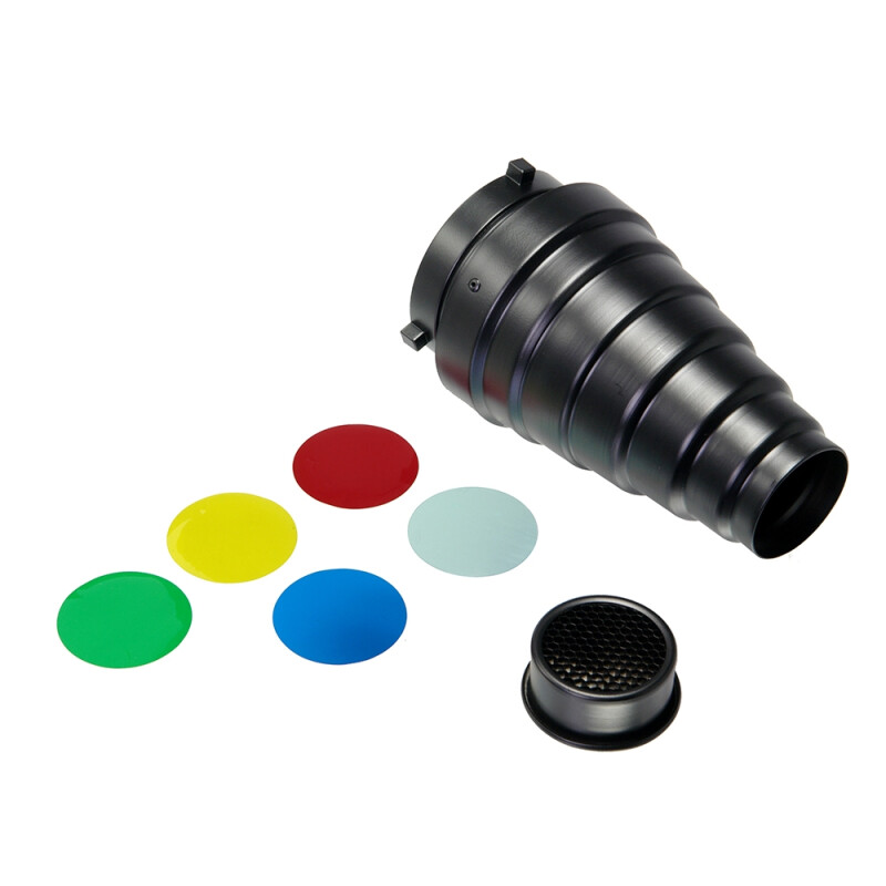 В комплект оборудования входят: октобокс 95 см, зонт серебро 165 см, сферический октобокс 65 см, конусная насадка с цветными фильтрами.